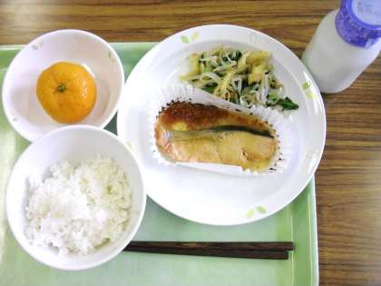「ごはん、鮭の味噌マヨネーズ焼き、カリカリ油揚げと野菜のおひたし、冷凍みかん、牛乳」です。