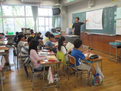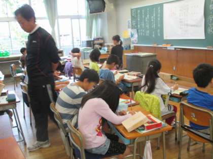 4年1組では、国語の語彙の学習で、「漢字の足し算」の授業が行われました。漢字を組合わせて、熟語を作りながら、熟語の構成についての理解を深めます。ワークシートにある14個の漢字をいろいろと組み合わせてたくさんの熟語を作り、その組み合わせについて、積極的に自分の考えを発表することができました。さすが4年生となると、辞典の使い方も慣れたもので、自分でどんどん調べることもできました。