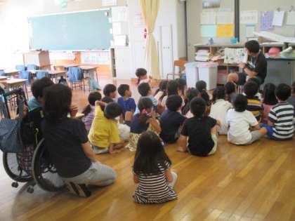 1学期に引き続き、特別支援学校に通っている副籍交流のお友達が、音楽朝会と1年1組の授業に参加しました。教室では、みんなといっしょに絵本の読み聞かせの授業を、笑顔いっぱいで受けていました。また、いつでも八幡山小学校に来てくださいね。