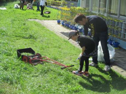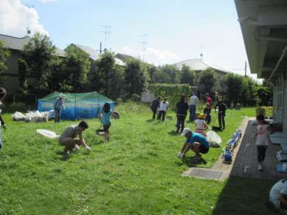 9月に入ってから天候不順が続いていましたが、この日は久しぶりの暑い日差しに、途中休憩をとりながら1時間作業に当たっていただきました。一部学級園の雑草取りにもご協力いただき、見違えるようにすっきりしました。