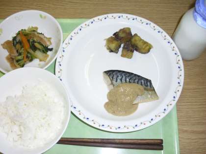 「ごはん、鯖のごまだれかけk、さつま芋の含め煮、煮びたし、牛乳」です。