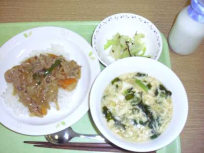 「スタミナ丼、キャベツの塩昆布かけ、かきたま汁、牛乳」です。