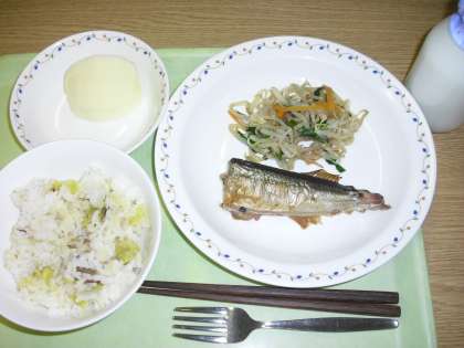 「さつま芋ごはん、秋刀魚の塩焼き、もやしのごま風味、りんご、牛乳」です。