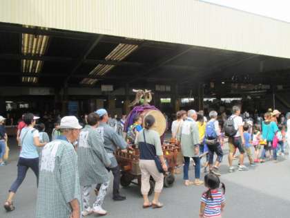 大通りでは交通規制が行われ、安全には十分な配慮がなされています。近隣の運輸会社をお借りしての休憩では、全ての神輿と山車が集合して休息をとりました。