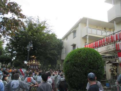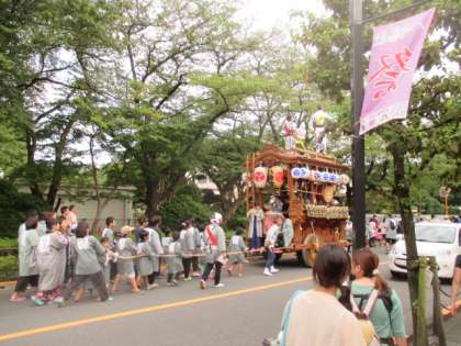 集会所での休憩をはさんで、巡行は終盤に突入しました。さらに、赤堤通りを進んでいきます。子どもたちも、まだまだ元気に山車を引いて、祭りを盛り上げています。