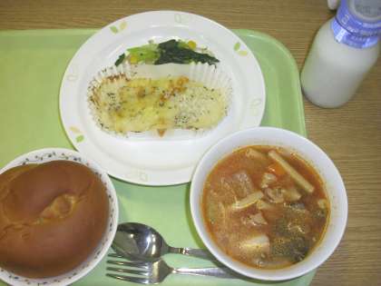 「黒砂糖パン、ポテトのクリーム焼き、青菜のソテー、ミネストローネ、牛乳」です。