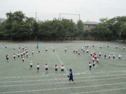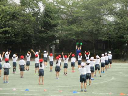 1年生は校庭を使ってのダンスの練習。並び方を確認しながら、全曲通しで踊っていました。担任の先生はさらにダンスのグレードアップを要求しますが、子どもたちも必死についてきています。みんな気合いが入っています。