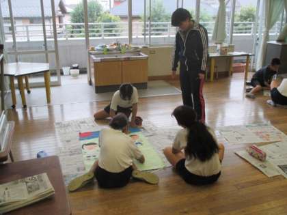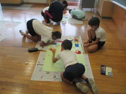 装飾係の児童も、入退場門に飾る絵を仕上げていました。グループで協力して、ていねいに着色していました。運動会を盛り上げるために、5、6年生は一生懸命がんばっています。