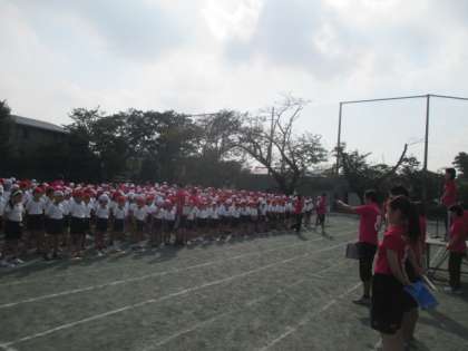 先週の金曜日に行われる予定だった1回目の全校練習が、朝会に引き続き行われました。まずは、赤白に並びなおしての初めての整列です。しっかり、自分の位置を覚えてくださいね。
