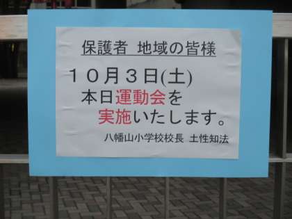 運動会は予定通り実施されます。児童の登校は、8時から8時10分です。早すぎないように登校させてください。参観される保護者の入場は、東門のみとなりますので、ご注意ください。7時55分開門予定です。