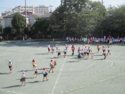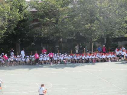 子どもたちは教室で着替えを済ませて健康観察を終え、校庭に移動します。自分の椅子と着替えなどを持って、応援席に並びました。いよいよ入場です。運動会が始まります。