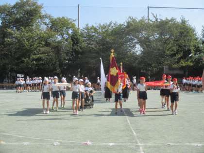 児童入場です。前後左右しっかりそろっての入場です。応援団長を先頭に、子どもたちは元気に行進し、整列しました。