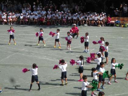1年生は初めての運動会。最初の出番は、表現種目「VIVA 八小 GUTS!」です。色鮮やかなポンポンを振りながら、リズムに乗って踊りました。1年生らしい、とてもかわいらしいダンスでした。