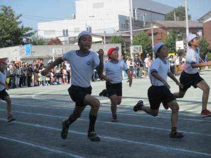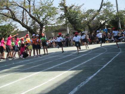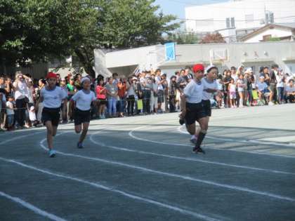 後半戦最初の得点競技は、5年生の100m走です。さすが高学年、コーナーの走りにも迫力があります。ゴール直前まで接戦となるレースが続き、追いかける白組の応援は、ますますヒートアップしていました。