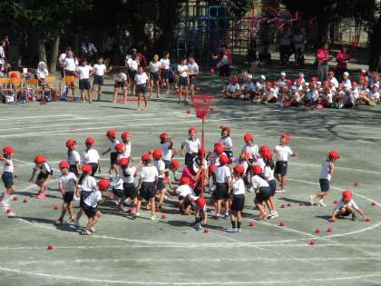 1年生の団体競技は、大好きな「エビカニクス」の曲に合わせての、ダンシング玉入れです。曲が止まったら、玉入れをするというルールです。かわいらしい踊りと、必死に玉を拾って投げる様子がてても楽しい競技でした。