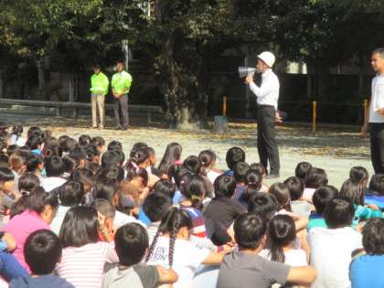 休み明けの火曜日、2時間目に避難訓練がありました。今日は地震を想定した訓練でした。4分44秒で避難は完了できましたが、校長先生からは、訓練だからと言って気を緩めてはいけないというお話がありました。また、本日は烏山総合支所の方々に来ていただき、地震の時には何よりも自分の頭を守ることを教えていただきました。