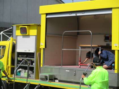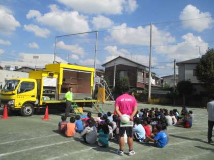 全校での避難訓練の後、烏山総合支所の方々のご協力で、5年生が起震車体験をしました。震度5以上の地震を実際に体験できる車に、数人ずつ交代で乗り、もしもの時の自分の身の守り方を体験的に学びました。