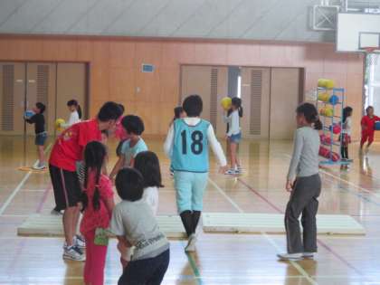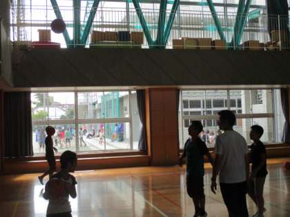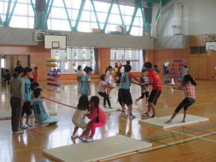 中休みの体育館を開放して、体育委員会が中心となり、いろいろなスポーツや運動の体験会を行いました。綱を引っ張り合って、身体のバランスを鍛える運動や、バスケットボールのフリースローなど、1年生から6年生までいろいろな学年が、楽しく運動に親しみました。