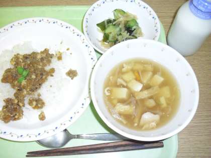 鯖のそぼろは、隠し味に生姜や味噌を使い、ごはんの進む味付けになりました。八幡山小では、白ごはんに比べ、混ぜご飯や丼物の残食率が高い傾向にあります。今日はスプーンをつけ、低学年でも食べやすくなるようにしてみました。