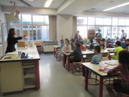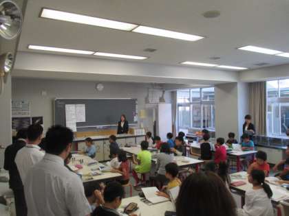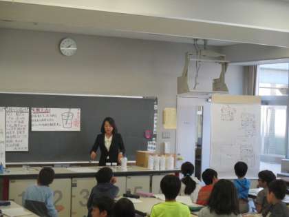 5校時、4年2組で理科の校内研究授業が行われました。「自然の中の水」の単元の学習で、空気中にはどの場所にも水蒸気があることを検証する実験の授業でした。実験方法を確認し、班に分かれての活動をします。子どもたちには、とても意欲的な姿が見られました。