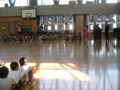 八幡山小学校開校55周年の記念集会が、児童集会のロングバージョンで行われました。代表委員の児童が中心になって式のプログラムが計画され、集会は進行されました。はじめの言葉とプログラムの発表の様子です。