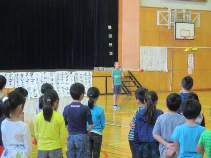 楽しい集会も終わりの時間になりました。代表委員の終わりの言葉と、本日八幡山小の昔のお話をしていただいた尾崎さんにお礼をして、記念集会は無事閉幕しました。