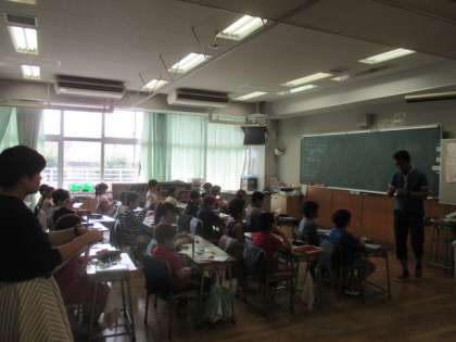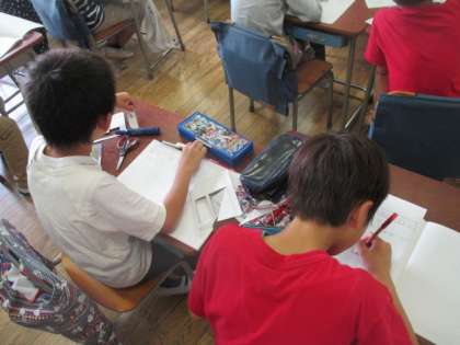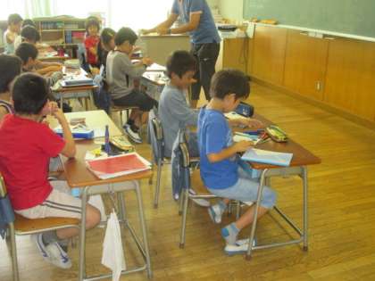 3年1組では算数の「円と球」の導入で、コマ作りを通して円について考える授業を行いました。いろいろな形のコマを自作し、回した時の様子を観察しながら考察します。コマを片手に、真剣に課題に向かいながら、自分なりの考えをまとめていました。この授業は、校内の若い先生方が授業を参観して検討をする自主的な研修も兼ねていました。先生方は授業研究を重ね、教員として日々研鑽を積んでいます。