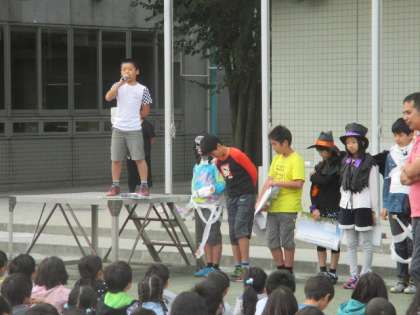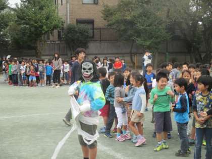 今朝の児童集会は、ハロウィンにちなんでのクイズ集会。集会委員の児童が出題する問題に答えて、ハロウィンのふん装をした委員の子どもたちから逃げながら移動します。どの学年の子どもたちも、校庭に描かれた円から円へと、歓声をあげながらも楽しそうに逃げていました。ちょっと肌寒い朝にぴったりの集会でした。集会委員のみなさん、会の企画・運営ご苦労様でした。次回も楽しみにしています。