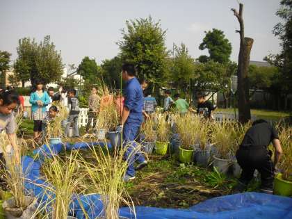 5年生がバケツで大事に育てた稲の刈り取り作業が行われました。稲穂が垂れた後、スズメよけのネットをかぶせてからさらに大きく実りました。いよいよ収穫の時期です。鎌の使い方を教わり、順番に自分のバケツの稲を刈り取ります。さぁ、上手に刈れるかな。