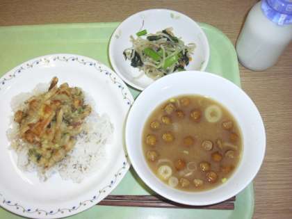 「かき揚げ丼、おひたし、味噌汁、牛乳」です。