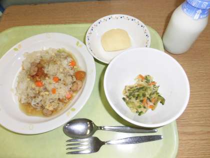 「あんかけチャーハン、中華サラダ、りんご、牛乳」です。