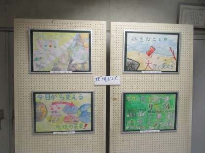 月曜日の全校朝会で表彰された環境ポスターの入選作品が、1階フロアに展示されています。ご来校の際には、ぜひご鑑賞ください。