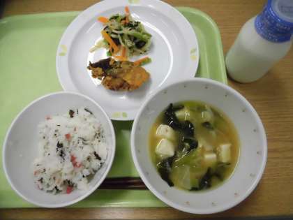 「梅わかごはん、鯖の竜田揚げ、野菜の辛子醤油、味噌汁、牛乳」です。