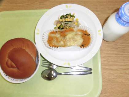 「ココアパン、南瓜のグラタン、青菜のサラダ、牛乳」です。