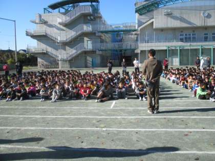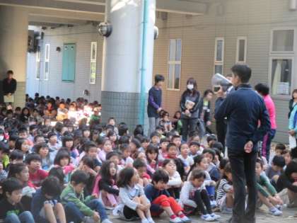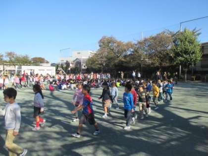 楽しい集会が終わった直後、11月の避難訓練が行われました。全校児童が集まる体育館で地震が起こり、その後家庭科室から出火して、学校から二次避難場所まで避難するという想定でした。二次避難場所の八幡社まで「お・か・し・も」の約束を守り、全校一斉に避難します。いつもと違った想定に少し戸惑う様子も見られましたが、災害が発生したら、どんな状況でも冷静に行動することが大切になります。今日の訓練をしっかりふり返って、いざという時のために気持ちの準備ができるようにしておいてください。