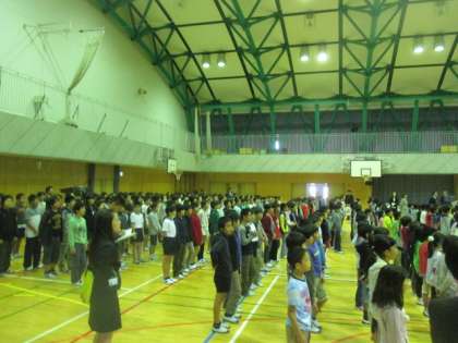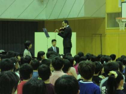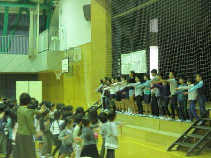 今朝の音楽朝会は、学芸会を1週間前にひかえて歌の練習を全校で行いました。「学芸会の歌」と「55(ゴーゴー)八幡山」の2曲です。「学芸会の歌」は、坪木先生のバイオリンも加わって流麗に歌い上げ、「55八幡山」は、振り付けをつけて盛り上がりました。学芸会に向け、歌を通して全校児童の気持ちもひとつになっています。