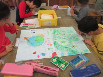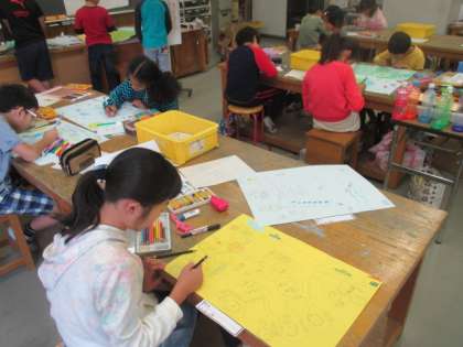 4年2組の1時間目は図工です。自分たちの未来を想像した絵画作品を仕上げていました。芸能人になることを夢見ている作品や、自分の銅像が建っている未来予想図を描いた作品など、明るく楽しいものばかりでした。みんな実現できるといいですね。