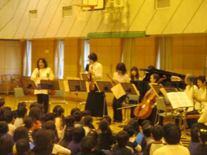 毎年恒例になっている「ようこそ先輩コンサート」が行われました。本校卒業生のご好意で、校舎が改築された年から続いている教育活動です。子どもたちがプロの演奏家の方々の生演奏を聴き、音楽のすばらしさを感じて、音楽に親しむ態度が育つように企画されています。今年の演奏曲は、チャイコフスキー作曲、バレー組曲『眠りの森の美女』。まず、第1部は1〜3年生が鑑賞しました。