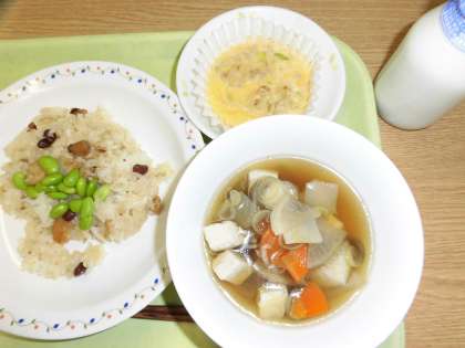 「まめまめおこわ、切干大根の卵焼き、けんちん汁、牛乳」です。