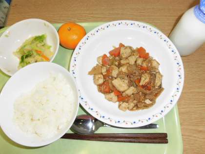 「ごはん、四川豆腐、辣白菜、みかん、牛乳」です。