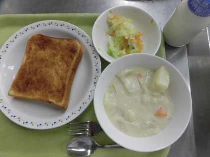 「シナモントースト、クリームシチュー、キャベツサラダ、牛乳」です。
