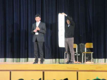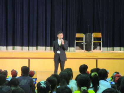 学芸会初日の児童鑑賞日です。校長先生のお話でスタートしました。セリフが上手に言えるように、ウォーミングアップの早口言葉も練習しました。