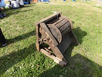 手順に従い、脱穀から行います。昔ながらの足踏み脱穀機の紹介を受けました。とても貴重なものに、子どもたちも興味津々です。