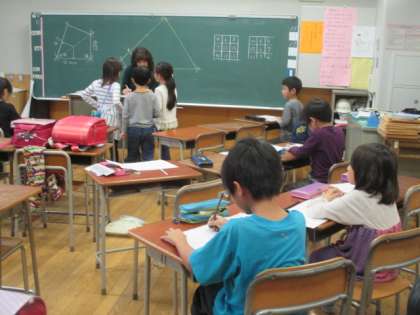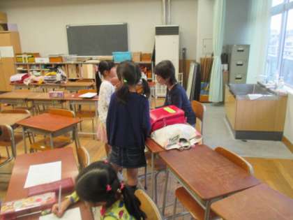 クラブ活動の時間に、1年生から3年生は補充授業を行っています。今日は2年生が算数教室で、かけ算や引き算の補習を受けていました。先生とマンツーマンで指導を受けながら、繰り返し九九を唱える子や、百マス計算のプリントにチャレンジする子など、どの子もみんながんばっていました。