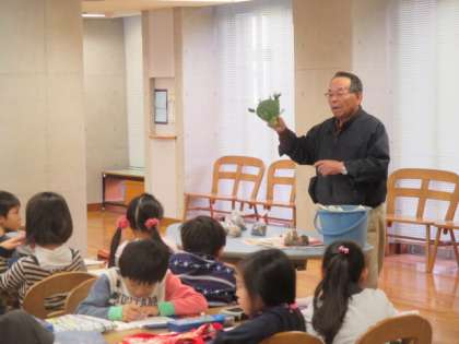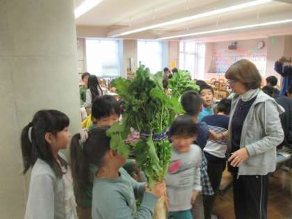 3年生は社会科の授業で、午前中に地域の農家の畑を見学させていただきました。そして、午後には農家の方に来校していただき、野菜作り等のお話をうかがいました。キャベツやネギ、小松菜など、世田谷でとれるおいしい野菜を紹介していただき、栽培の工夫等について、詳しく説明を受けました。持ってきていただいた大きな大根を見て、3年生の子どもたちはみんな歓声をあげていました。