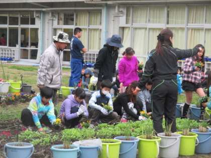 世田谷区の「花の栽培指導」事業で、5年生が区内の生産農家の方々から指導を受けました。世田谷産(せたがやそだち)の花苗を、一人ひとり学校園に植えました。きれいな花が咲くように、しっかりお世話をしてください。