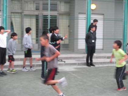 大会の概要の説明を受けた後、子どもたちは校庭に出て、本番で走る1キロメートルの距離を実際に走ってみました。小学生と中学生に分かれてタイムを計り、距離のイメージを身体で覚えます。中学生に負けず、小学生もなかなか好タイムが出て、大会への士気は一気に高まりました。