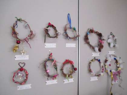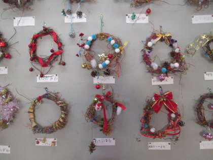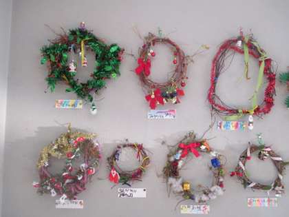 1年生の各教室には、生活科で制作したリースが飾られています。自然の素材を上手に使いながら、キラキラと鮮やかな装飾が施されています。子どもたちが一生懸命に作りました。保護者会の際には、ぜひご覧なってください。