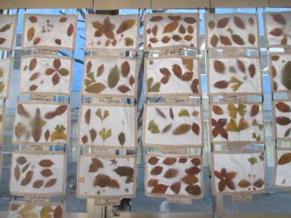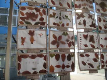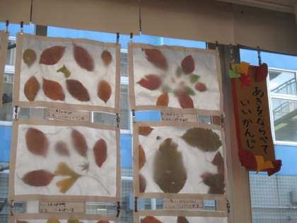 2年生のフロアにも、いろいろな作品が展示してあります。いろいろな色や形の落ち葉を集めて並べた「秋をならべていいかんじ」は、太陽の光に照らされて、確かにとってもいい感じです。