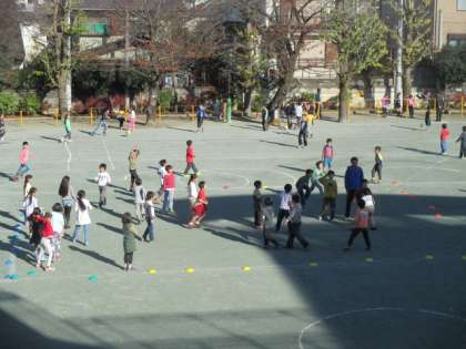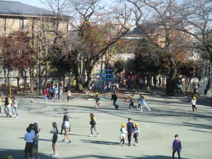 陽射しがとても暖かく、穏やかな昼休み。ほとんどの学年の子どもたちが校庭で元気に遊んでいました。先生も子どもたちと一緒に校庭を走り回っていました。楽しい午後のひとときです。